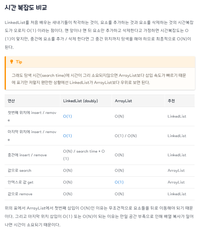 - 데이터 조회는 ArrayList가 우위에 있고, 데이터의 삽입/삭제는 LinkedList가 우위에 있다.